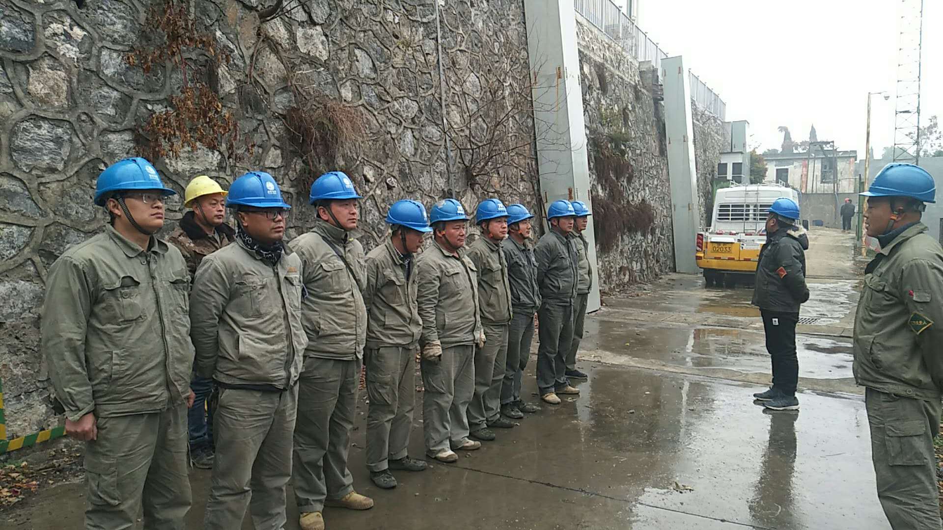 圖二:某變壓器增容改造項目現(xiàn)場,施工人員頂著寒風、冒著冷雨召開班前會。